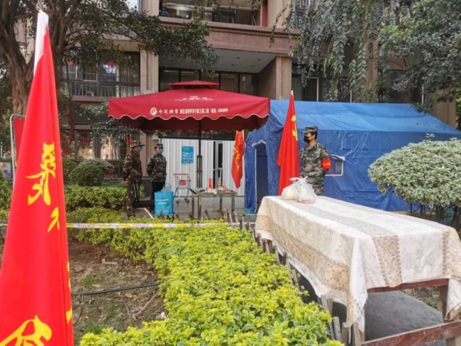 由于疫情防控需要,金海世纪城21栋于2月初暂时进行封闭管理,为了保障好集中居家隔离观察点里住户们的日常生活,接到东区退役军人事务局通知后,东区退役军人志愿服务队部分队员第一时间来到了这里配合社区展开志愿服务。隔离期间,队员们三班倒,每天开展蔬菜配送、入户排查、清洗消毒等工作,到2月14日,他们已经在此坚守了14天。
