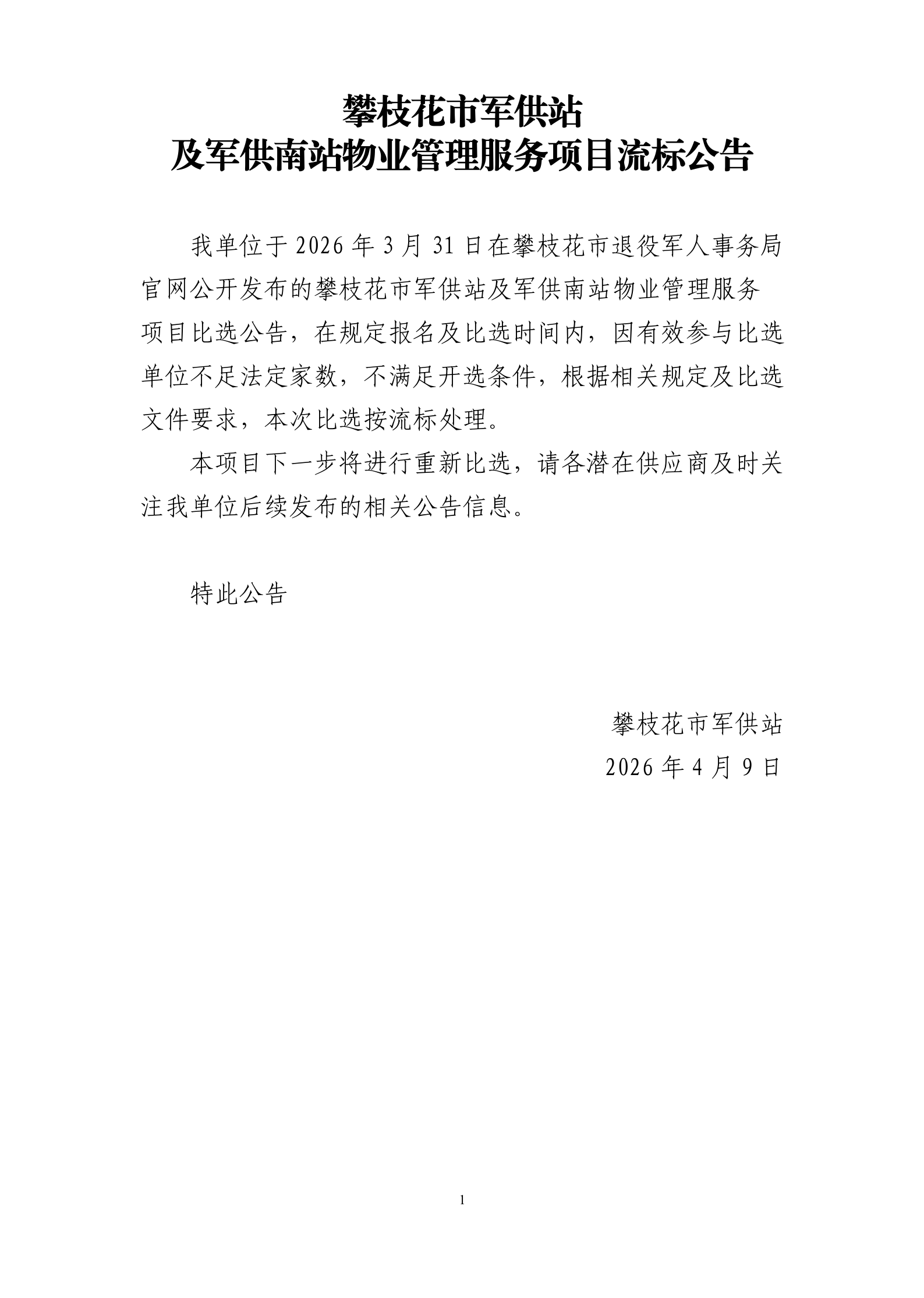 攀枝花市军供站及军供南站物业管理服务项目流标公告